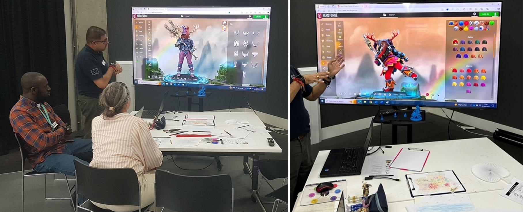 Our workshop structure was inspired by a lifedrawing room, but instead of easels, we had screens surrounding a 360 camera. As inclusive researchers we have embraced this 360 technology which means no one is behind the camera, we are all included in the image, and anyone can take the image. Four screens with mixed teams of delegates and purpleSTARS, explored various AI applications including NightCafe, Deep AI, Soundraw, and a gaming 3D modelling application called Hero Forge. We were keen to highlight where technology can empower us, and online modelling has done this by giving many of our team access to creating 3D models which we have developed into posters promoting health issues, and characters for a role play quest at St Fagans Museum of Wales.